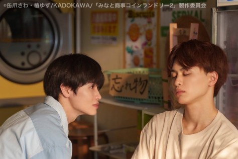 The lost-in-love laundromat owner Minato Akira (Kusakaw Takuya), and his besotted younger boyfriend, Katsuki Shintaro (Nishigaki Sho), are back in the second season of Minato’s Laundromat (Minato Shouji Coin Laundry).